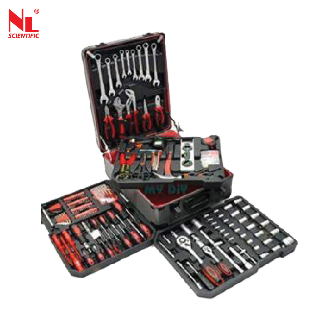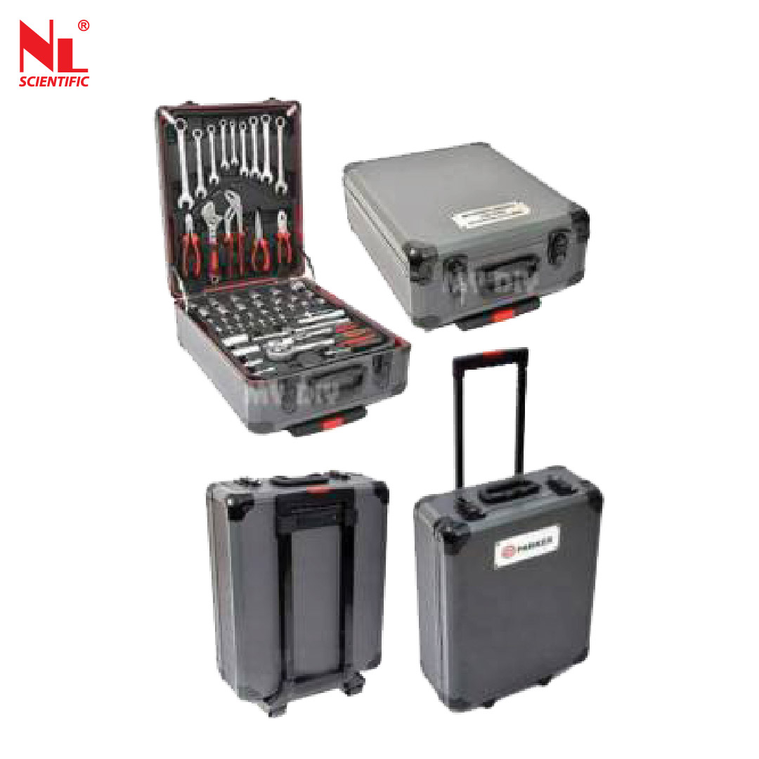 Tool kit combines an expensive range of useful everyday tools,accessories and parts to create an all-in-one package that is easy to transport or store away in a garage or vehicle to easy access. This tool kit comes supplied in a sleek aluminium flight case, with each compartment being dedicated to a particular tool type for easy reference. The supplied case also features an adjustable handle,a sturdy looking mechanism and free-moving wheels for easy portability.