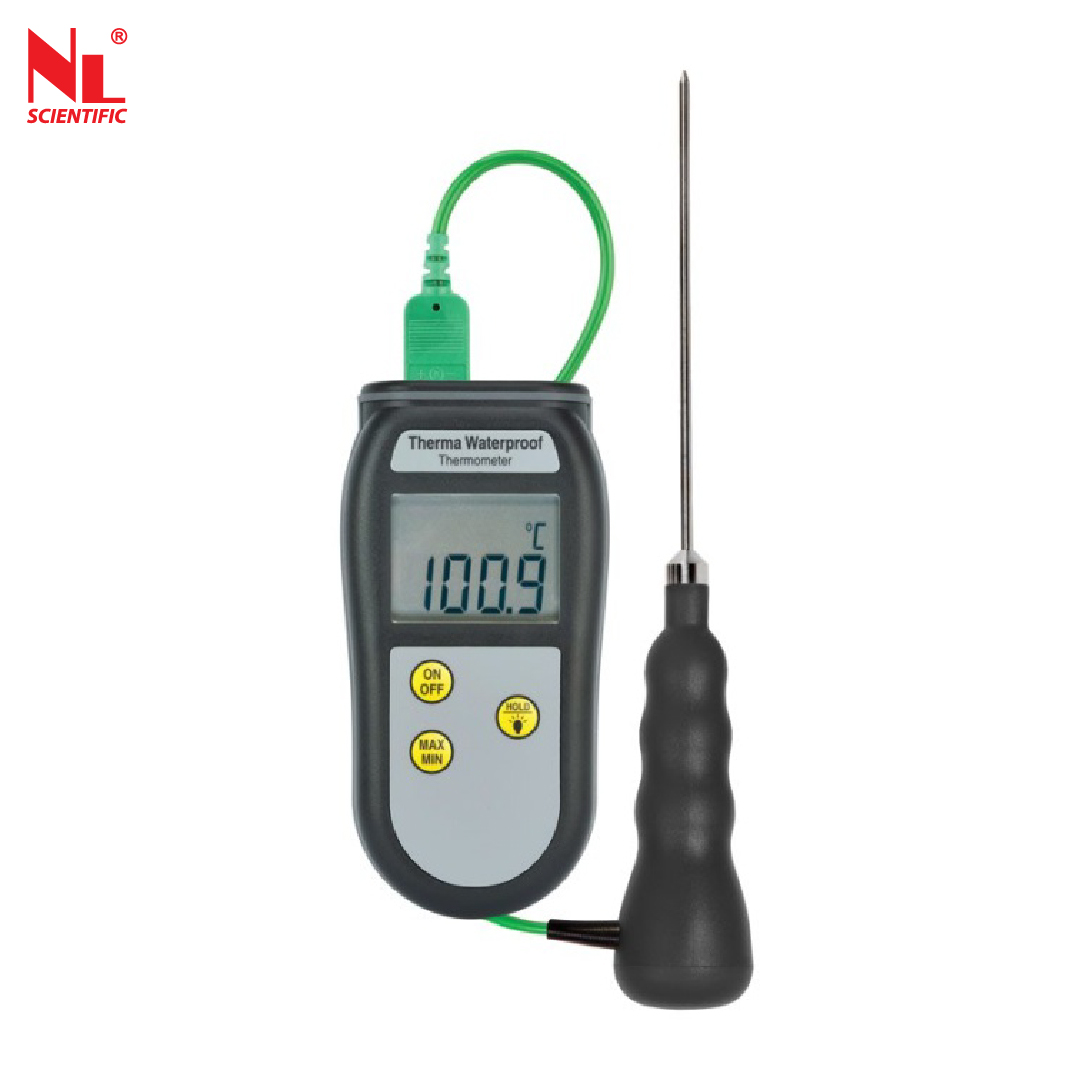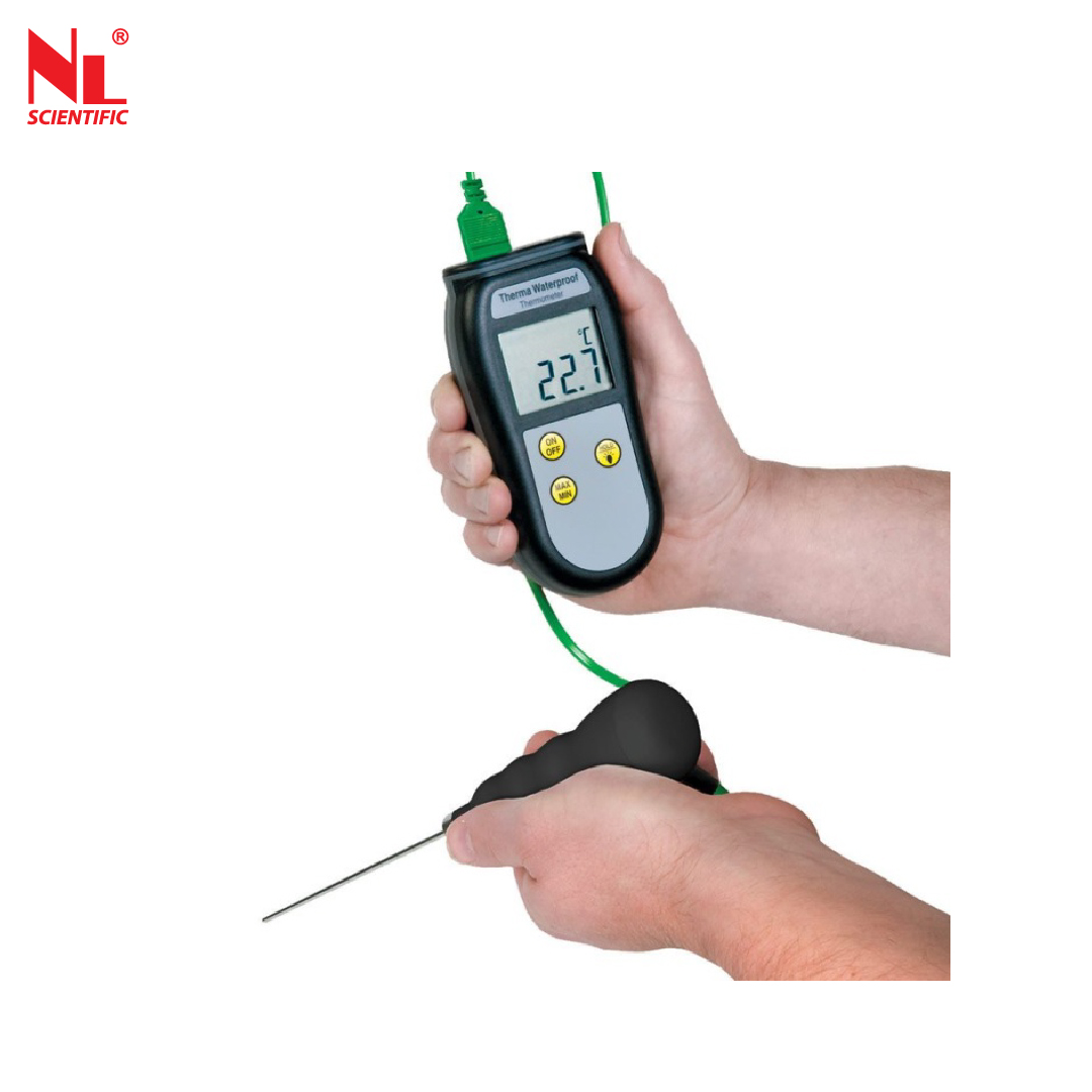 The Therma Waterproof thermometer designed for reliability and ease of use. Can be submerged or washed under a running tap-ideal for industrial applications. It measures temperature over the range of -99.9 to 299.9 °C with a 0.1 °C resolution, auto-ranging to 1 °C resolution over the range of 300 to 1372 °C.